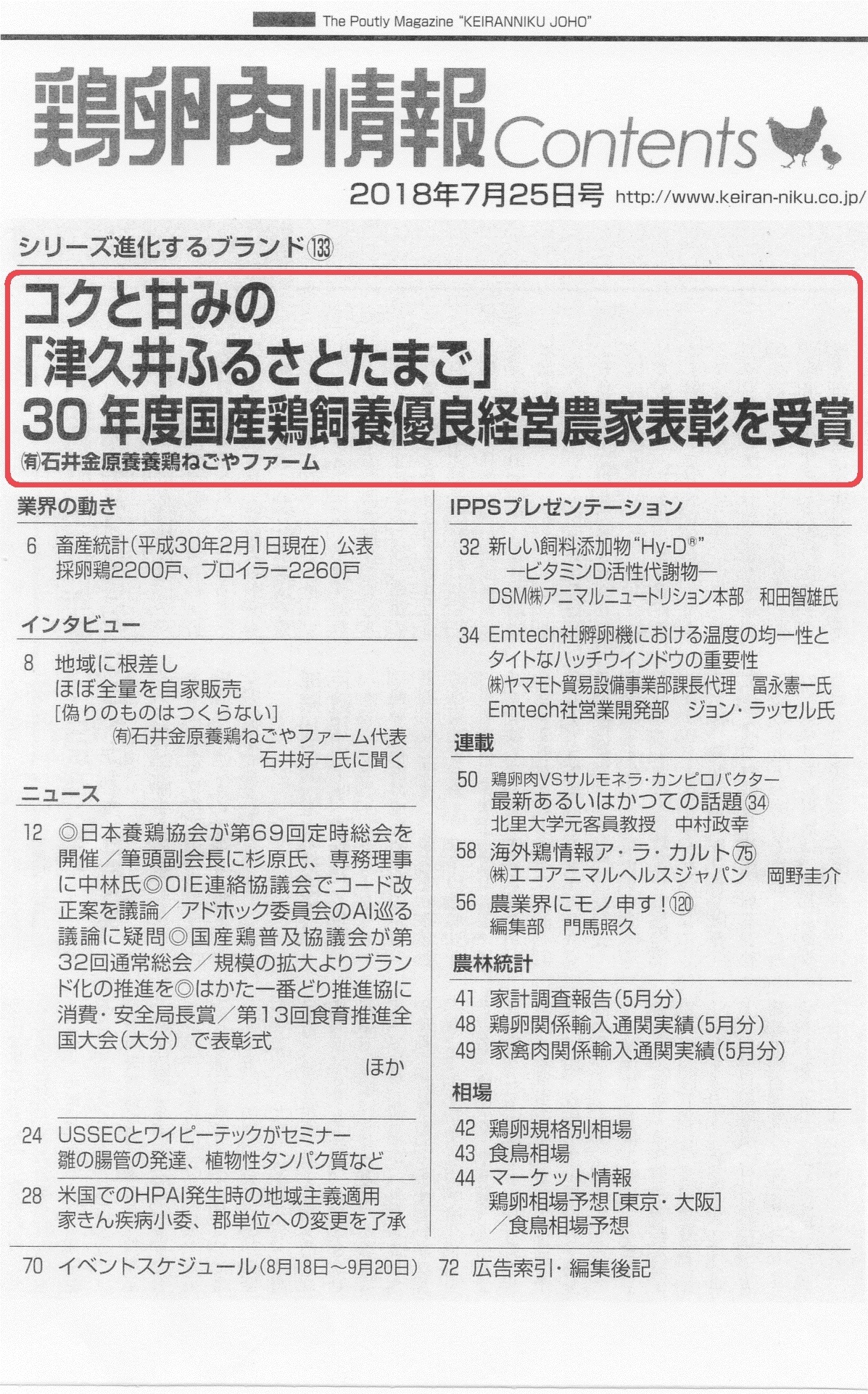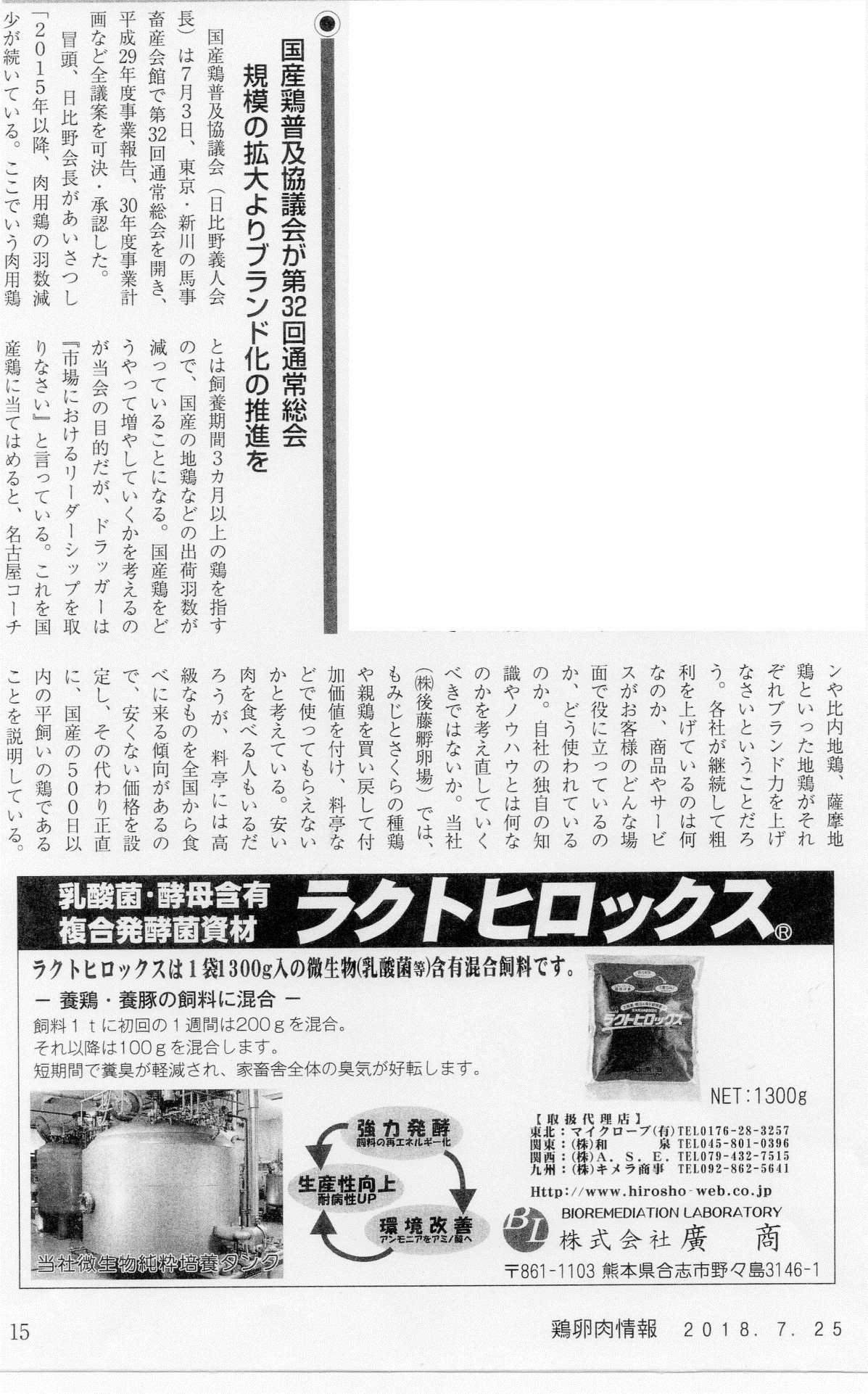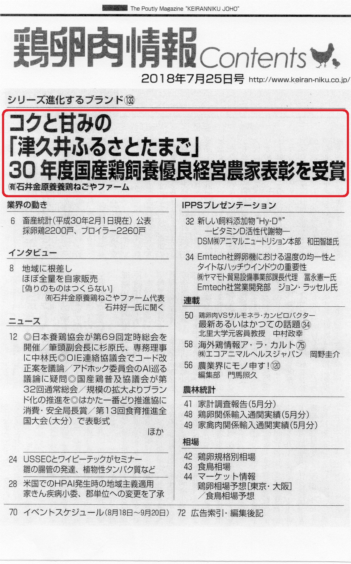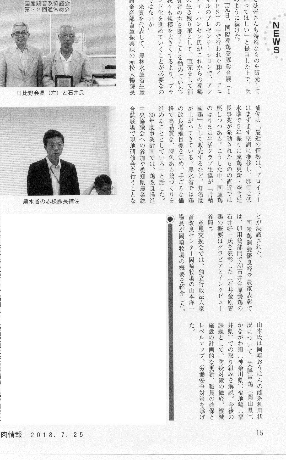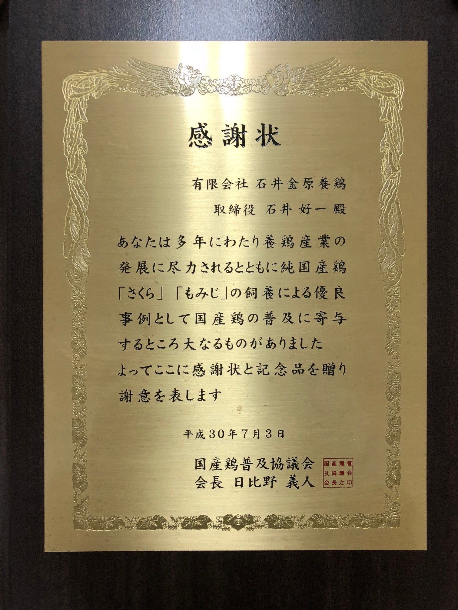 7月3日、国産鶏普及協議会は弟32回通常総会を開き、国産鶏の飼養者を対象とした『優良経営農家表彰』に当ファームの石井好一取締役が表彰されました。