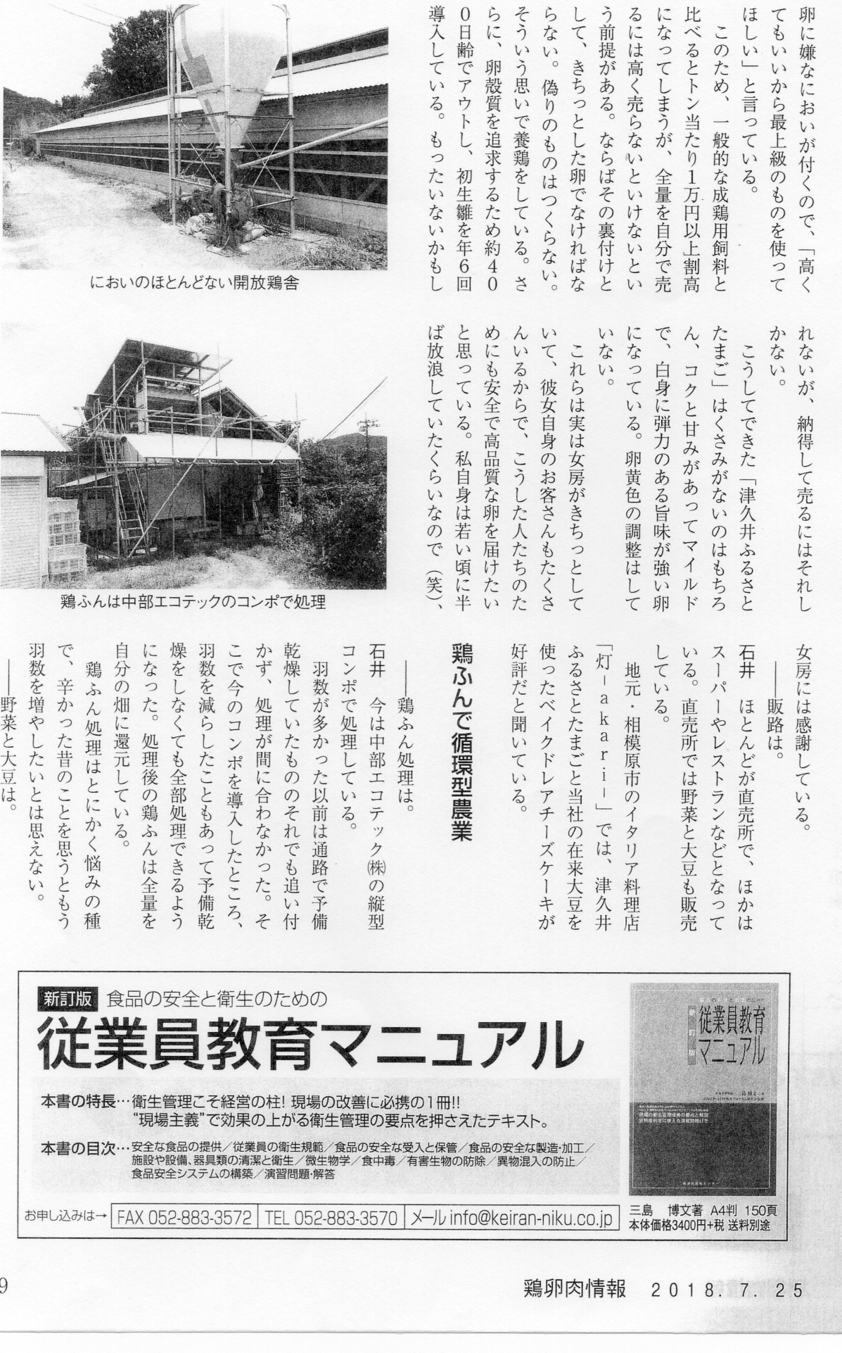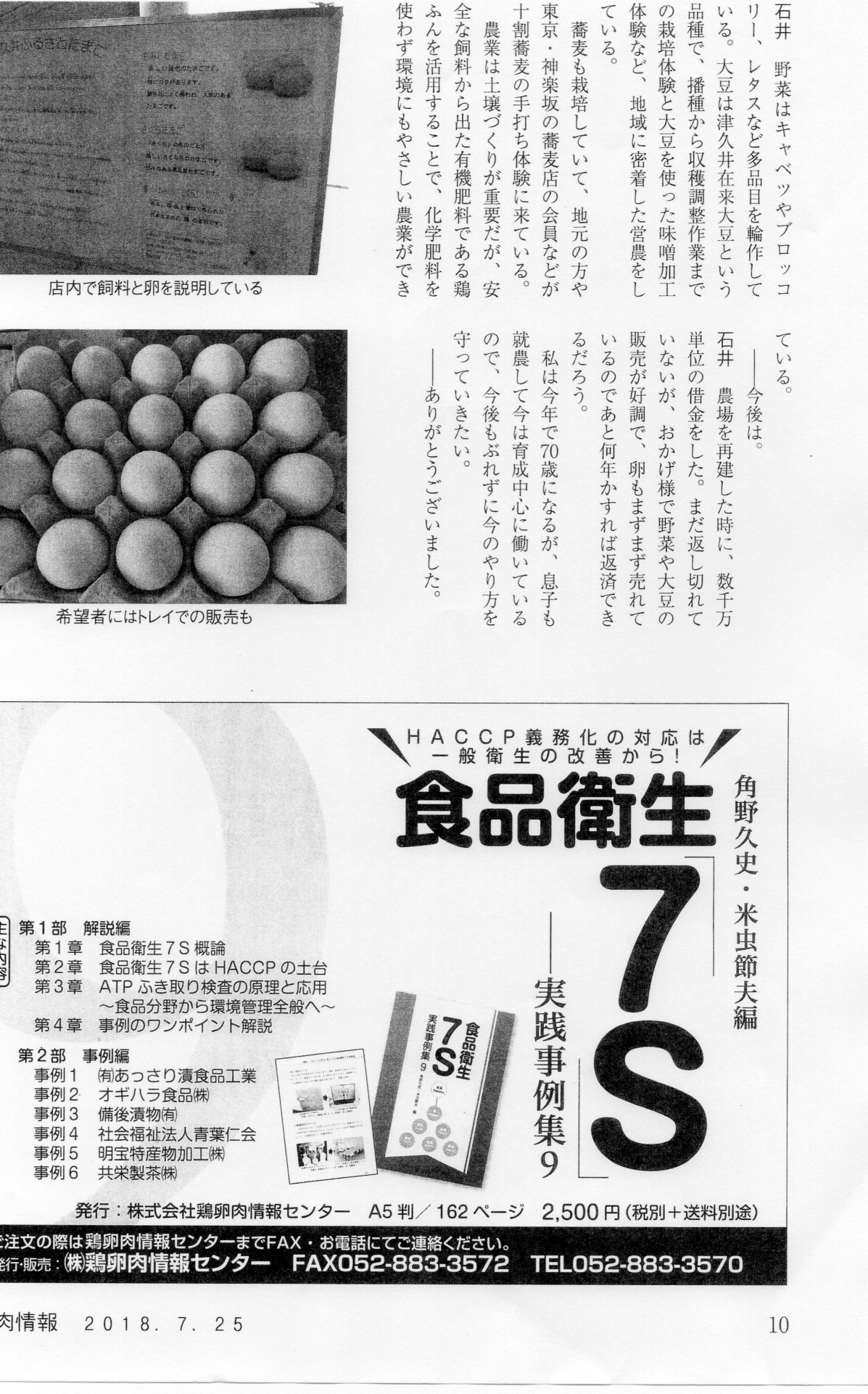 そして、自家直売に重きを置き、学校給食への納品にも至りました。飼料が鶏に優しいなら、鶏糞に現れ、良き肥料となります。化学肥料は土壌を疲弊させます。有機肥料は土壌の微生物にも優しいと言えましょう。農業は土壌作りが大事です。鶏糞を発酵・乾燥させる設備を備え、野菜・大豆栽培を始めました。
