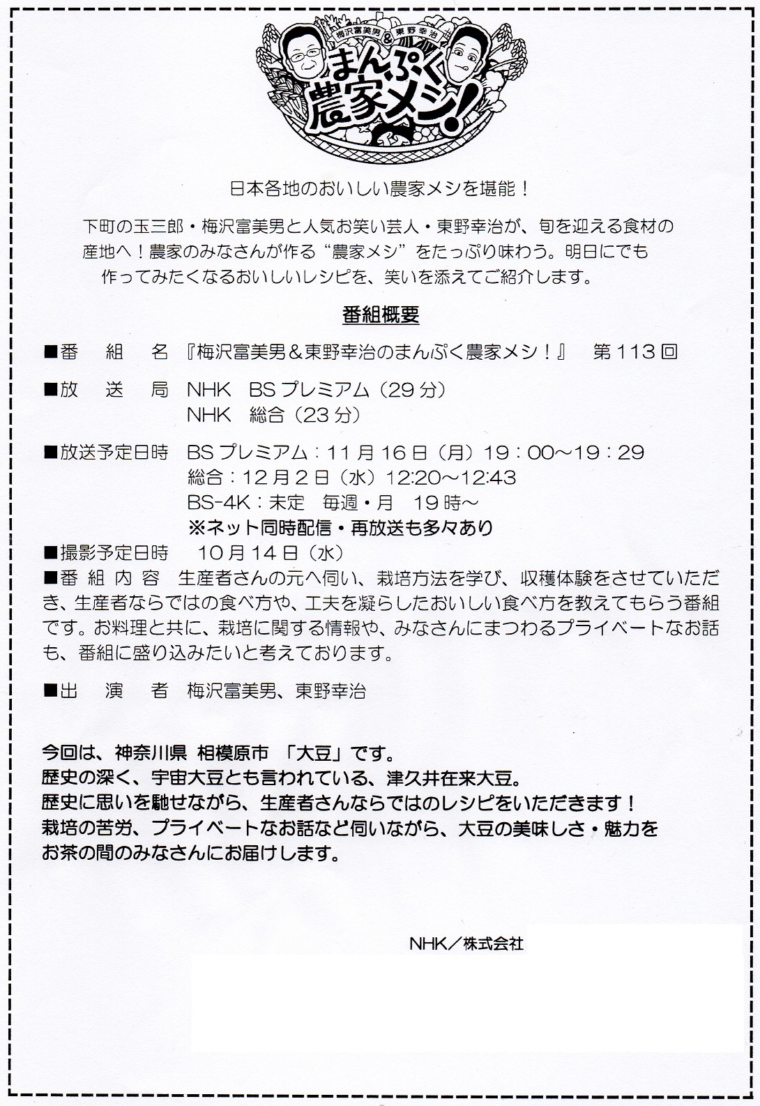 ねごやファームの津久井在来大豆について取材が有り、2016年2月27日に放送されました。