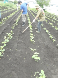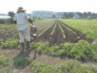 2、鍬で更に大豆の根元に人手で土を寄せる