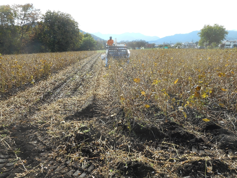 3、人手で刈り取り、収穫機(ビーンズスラッシャー)で大豆を収穫する
