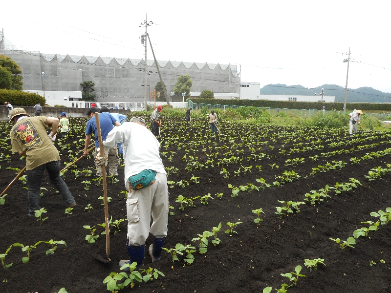 2、鍬で更に大豆の根元に人手で土を寄せる
