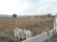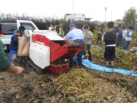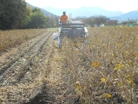 3、人手で刈り取り、収穫機(ビーンズスラッシャー)で大豆を収穫する